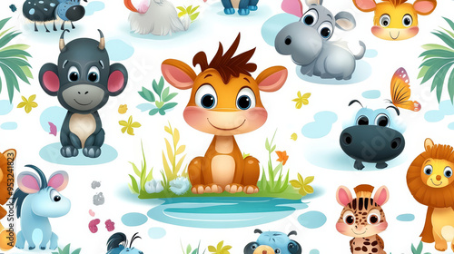 Naklejka premium Cute Cartoon Animals Seamless Pattern for Kids Fabric Wallpaper Baby...