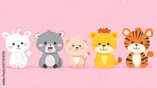© 11faqihtanjung, Obraz premium Cute cartoon animals sitting in a row on a pink background.
