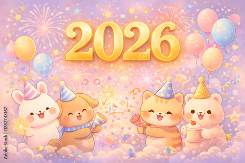 © Warisara, Fototapeta premium Cute cartoon baby and animal greeting card illustration with gifts and decorations for birthday or Christmas celebration