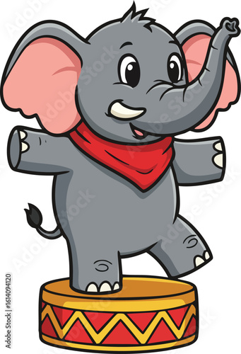 © OKAN, Fototapeta premium Cute cartoon baby elephant balancing on circus platform with red scarf and cheerful expression vector illustration