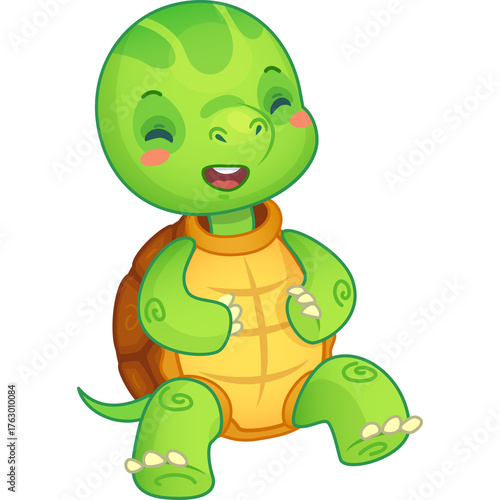 © lisa, Fototapeta premium Cute cartoon baby turtle character sitting happily with a smiling face and closed eyes green body orange shell transparent background high detail vector illustration