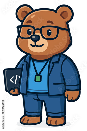 © Old Believer, Obraz premium Cute cartoon bear dressed in business attire with glasses holding a tablet featuring code symbols