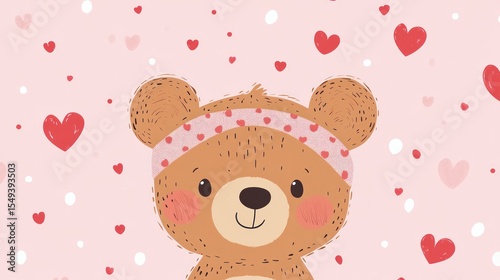 Obraz premium Cute cartoon bear with heart-patterned headband on pink background