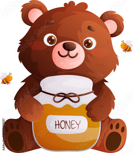 Fototapeta premium Cute Cartoon Bear with Honey Jar and Bees Illustration, Adorable Character