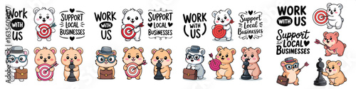 Obraz premium Cute Cartoon Bears Supporting Local Businesses, Playing Chess, Holding Target, Work With Us Illustrations