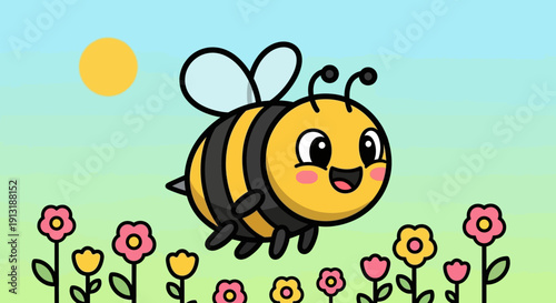 © Apolobay, Fototapeta premium Cute Cartoon Bee Flying Flowers.