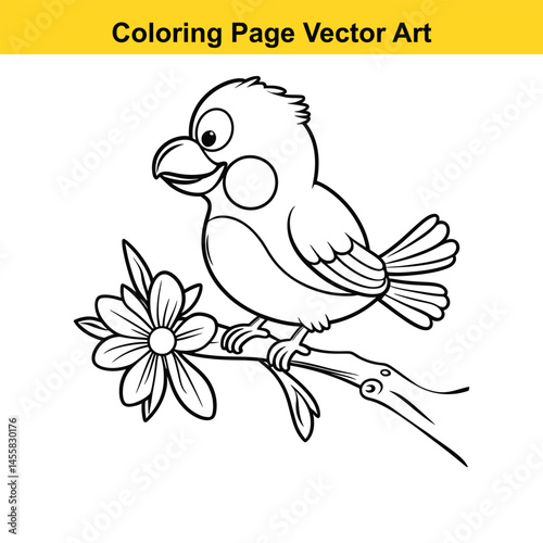 Fototapeta premium Cute Cartoon Bird on Branch with Flower Coloring Page