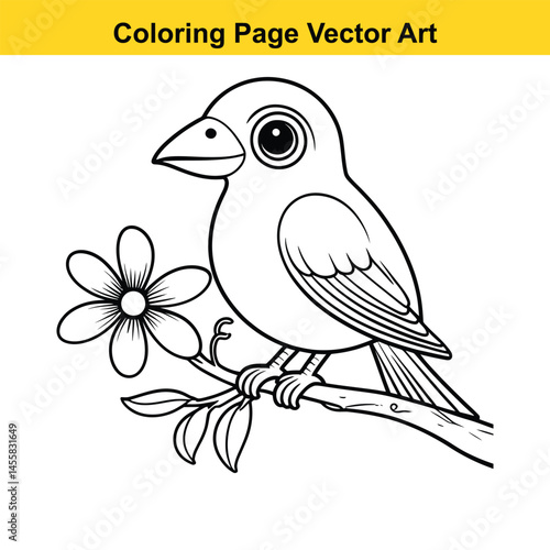 Obraz premium Cute Cartoon Bird on Branch with Flower Coloring Page
