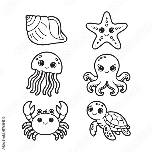 © Creative Design IT, Fototapeta premium Cute cartoon black and white line art drawings of a seashell starfish jellyfish octopus crab and sea turtle on a white background
