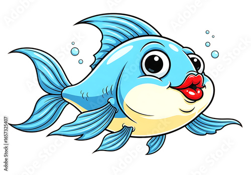Fototapeta premium Cute cartoon blue fish with big eyes and red lips isolated on transparent...