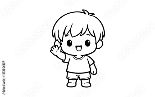 Obraz premium Cute cartoon boy waving hello with a happy expression and simple outline design