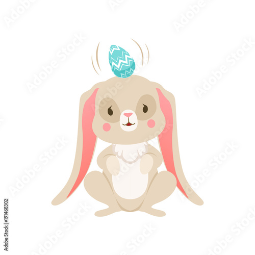 Fototapeta premium Cute cartoon bunny with egg on its head, funny rabbit character, Happy Easter concept cartoon vector Illustration