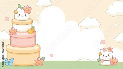 Fototapeta premium Cute Cartoon Cake with Flowers and Kawaii Cat