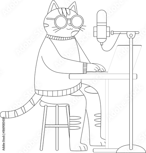 Obraz premium Cute Cartoon Cat Podcaster or Streamer Working on Laptop Coloring Page