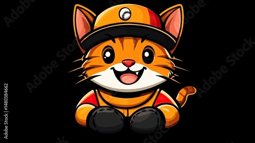 Fototapeta premium Cute cartoon cat wearing a cap, looking friendly, on black background