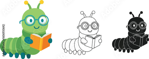 Obraz premium Cute cartoon caterpillar reading book vector illustration for kids education art