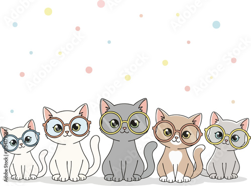 Fototapeta premium Cute cartoon cats wearing glasses and sitting in a row with a playful,...