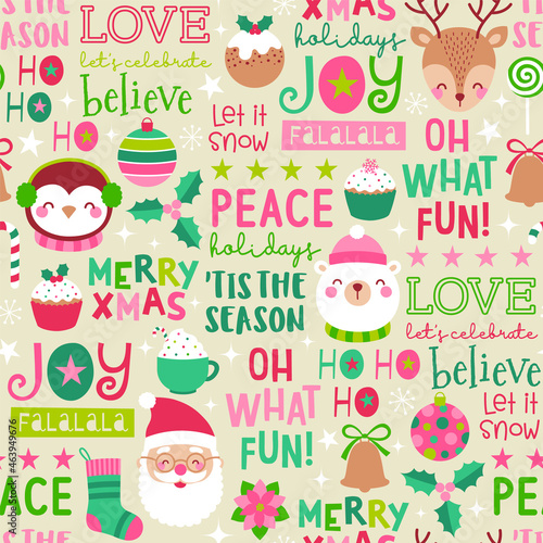 Fototapeta premium Cute cartoon character, christmas elements and typography design seamless pattern.