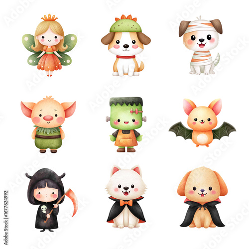 © GenBy, Naklejka premium Cute cartoon characters in Halloween costumes with whimsical designs and vibrant colors. Halloween Character isolated on white background, Transparent Background