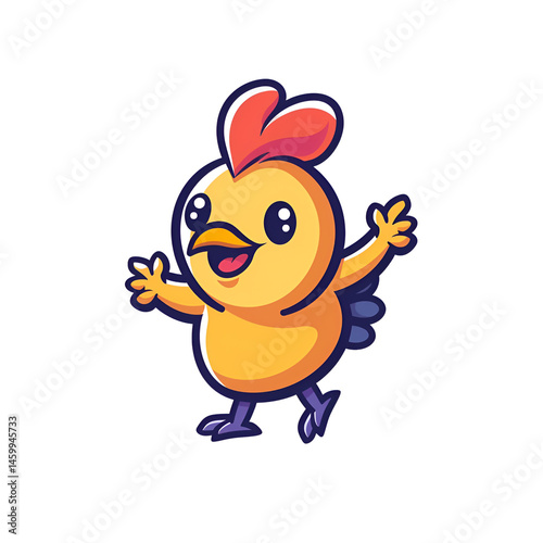 Obraz premium Cute cartoon chick with red comb happily spreading wings isolated on...