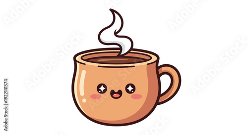 © Adi, Obraz premium Cute Cartoon Coffee Mug with Steam and Smiling Face.