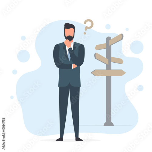 © Javvani, Obraz premium Cute cartoon confused businessman standing near pointer with different directions and choosing route, way, perspective. Flat isolated outline vector illustration on white background. Business template