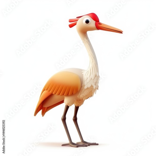 © NikahGeh, Obraz premium Cute cartoon crane stands proudly against white.