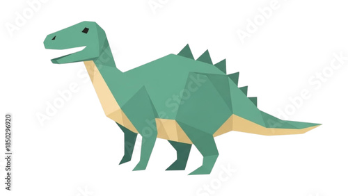 Fototapeta premium Cute cartoon dinosaur illustration, low poly art style, vibrant teal green prehistoric creature