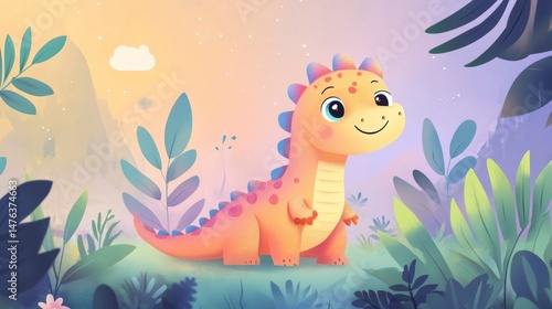 Obraz premium Cute cartoon dinosaur in a lush garden at sunset.