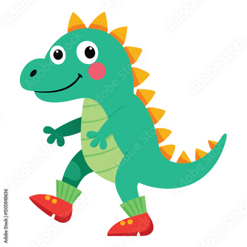 © MdYasin, Naklejka premium Cute cartoon dinosaur wearing shoes walking happy smiling green creature illustration