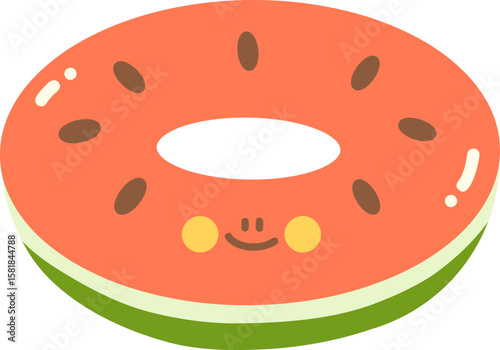 Obraz premium Cute cartoon donut with smiling face, featuring pink frosting and green base. This whimsical design is perfect for children themes, food illustrations, or playful graphics
