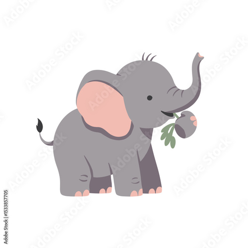 Naklejka premium Cute cartoon elephant happily munching on a leaf with a simple white background