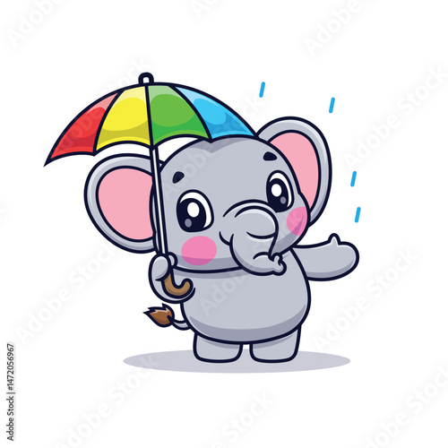 Obraz premium Cute Cartoon Elephant Holding Umbrella Rain Illustration Icon Vector, Animals...