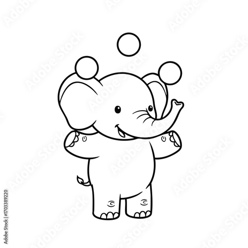 Obraz premium Cute cartoon elephant juggling three balls with a happy expression in a simple black and white line drawing style