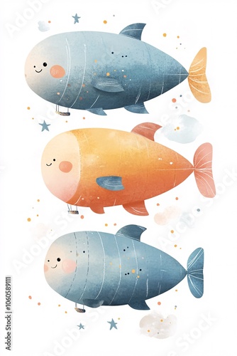 Naklejka premium Cute cartoon fish balloons swim playfully through the sky while delighting viewers with their adorable expressions and soft colors