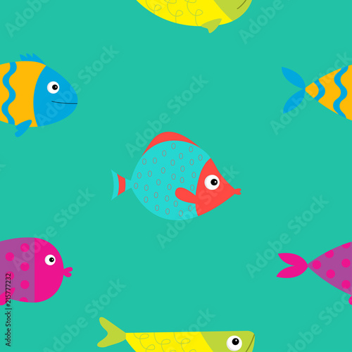 © worldofvector, Naklejka premium Cute cartoon fish icon set. Seamless Pattern. Flat design. Baby kids collection. Colorful aquarium animals. Green background. Isolated. Wrapping paper, textile template.