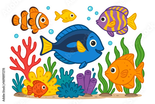 Fototapeta premium Cute cartoon fish set. Colorful underwater sea life scene. Vector illustration of clownfish, blue tang, swimming in ocean with coral reef, seaweed. Marine animal collection.