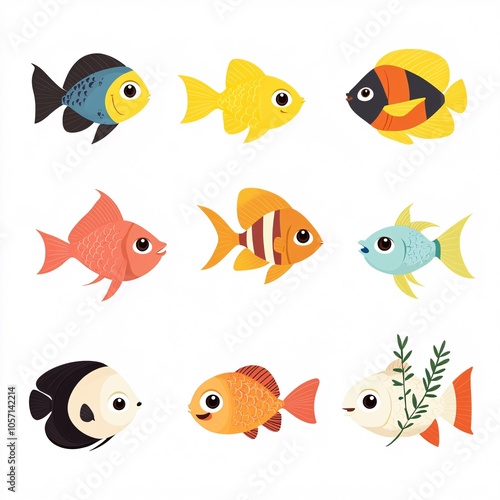 Fototapeta premium Cute cartoon fish swimming, on a white background, flat vector graphic designs, simple lines, cute cartoon fish,