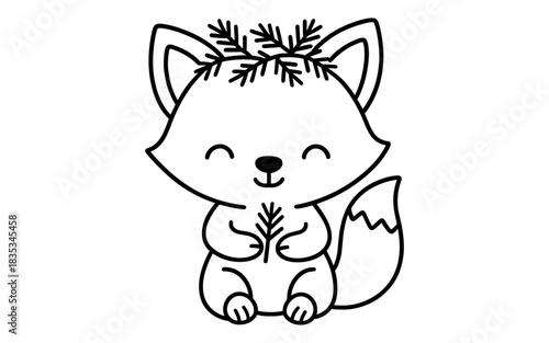 © 123levit, Naklejka premium Cute cartoon fox with branch crown and leaf in black and white line art