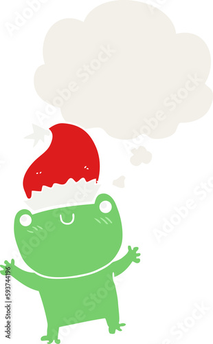Fototapeta premium cute cartoon frog wearing christmas hat and thought bubble in retro style