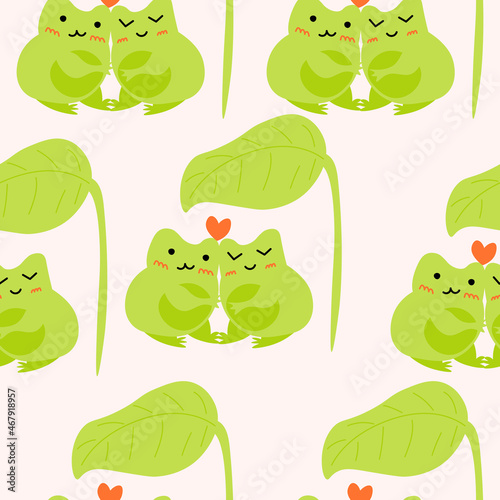 © Anna Eshka, Obraz premium Cute cartoon frogs with hearts. Enamored green toads. Vector animal characters seamless pattern of amphibian toad drawing.Childish design for baby clothes, bedding, textiles, print, wallpaper.