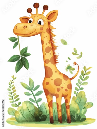Naklejka premium Cute Cartoon Giraffe Eating Leaves.