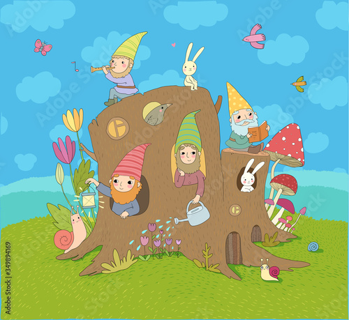 © Natallia_Chatkova, Fototapeta premium Cute cartoon gnomes in a stump house. Magic forest elves