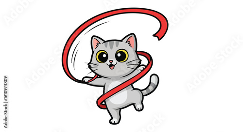Obraz premium Cute cartoon gray tabby cat playfully twirling a red ribbon.