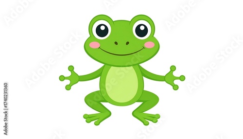 Naklejka premium Cute Cartoon Green Frog with Pink Cheeks on White Background