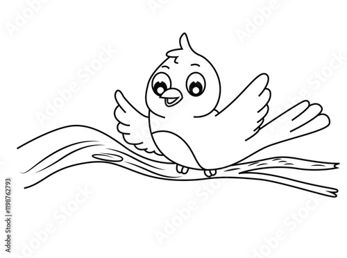 © Ravinder, Fototapeta premium Cute cartoon hand drawn vector funny baby bird sitting on tree branch coloring page.