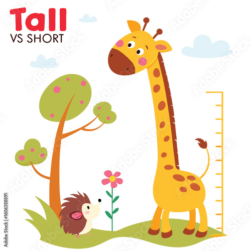 © Shakir, Fototapeta premium Cute cartoon illustration comparing tall and short with a giraffe and hedgehog next to a measurement chart in a playful style.