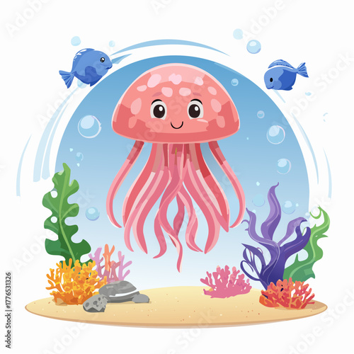 Fototapeta premium Cute Cartoon Jellyfish in Colorful Underwater Scene with Fish, Turtle, and Coral