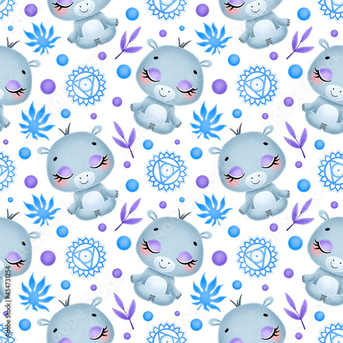 © Bonbonny, Fototapeta premium Cute cartoon jungle animals meditation seamless pattern. Yoga animals pattern. Hippopotamus meditates pattern.
