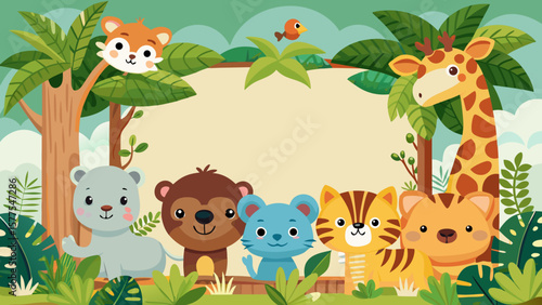 Naklejka premium Cute cartoon jungle animals with a blank space for text in a vibrant forest setting